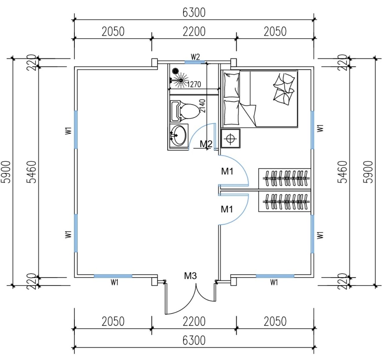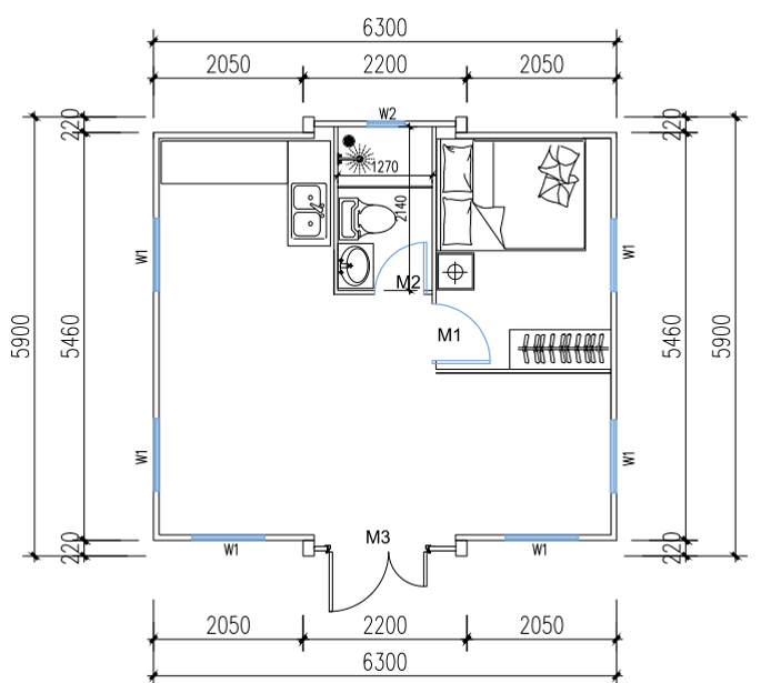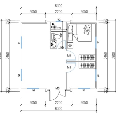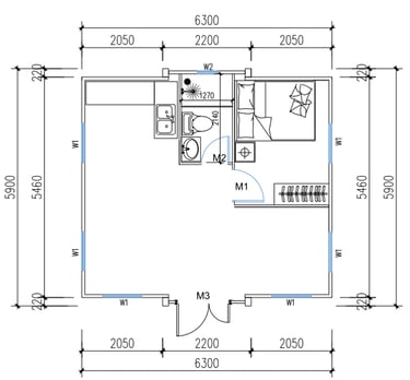 Plano del modelo MÜV-20 | 37 m² (un dormitorio privado, baño completo y un living comedor en forma de L)