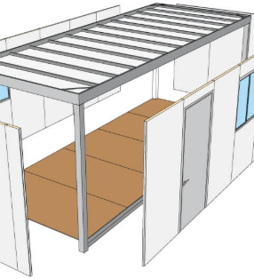 A continuación se instalan los paneles de muro, puertas y ventanas, así como divisiones interiores en su caso. Se procede con la instalación eléctrica y sanitaria si la hubiese.